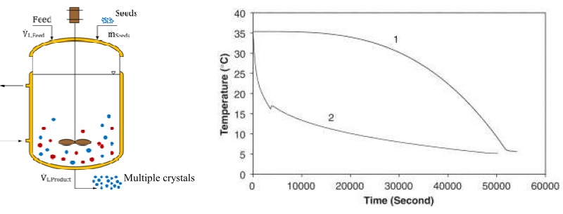 Figure 1. Batch crystallizer and operating temperature policies (1) and (2) for different final product quality