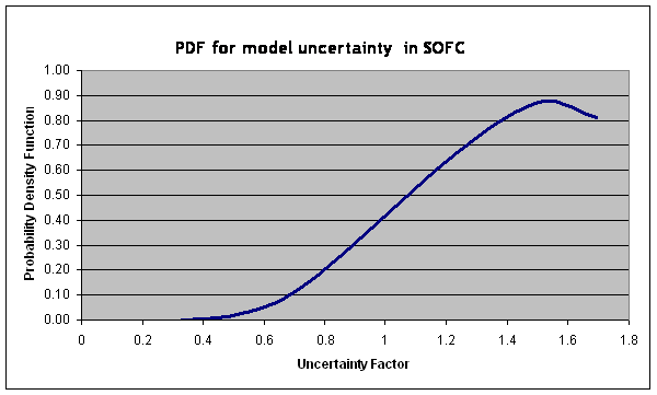 - Material induced uncertainty: Uncertainty due to the various materials used for anode, cathode and electrolyte in the SOFCs resulting in different performance curves. Uncertainty Factor (UF) (defined as the ratio of the experimental voltage to the model calculated voltage at each current density) distributions were computed for 45 different anode-electrolyte-cathode material combinations. The mean and variance for each distribution were estimated and finally, the series of means and variances were fit into two final distributions which represented the total uncertainty induced by materials.