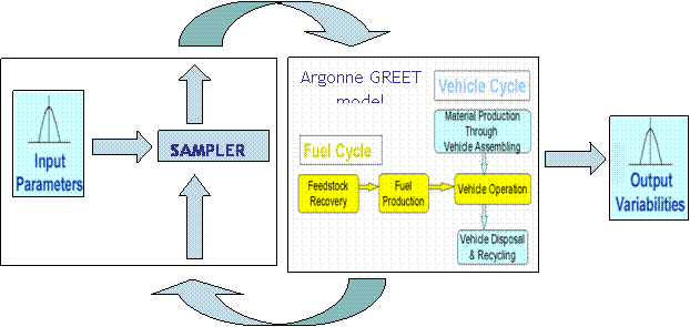 GREET is a complex model for estimating the full fuel-cycle energy and emission impacts of various transportation fuels and vehicle technologies considering the fuel cycle from wells to wheels and the vehicle cycle through material recovery and vehicle disposal developed by Argonne National Labs. The GREET model incorporates large number of input parameters associated with the output results. Many of the input parameters assumptions involve uncertainties, which require probability distributions to represent the trend of occurrence of the parameter over a specific range defining the uncertainty. Since some of the parametric assumptions in GREET are uncertain, the resulting output variables have to be represented by distributions. To address these uncertainties, we have developed a stochastic simulation tool to incorporate various sampling techniques. The tool has been built through an excel add-in file, developed using Visual Basic macros, which interfaces with the user and calls external files in the form of FORTRAN compiled dynamic link libraries (DLL) to assign probability distributions and perform sampling on the input parameters. The tool also has the capability to perform statistical analysis on the output results.