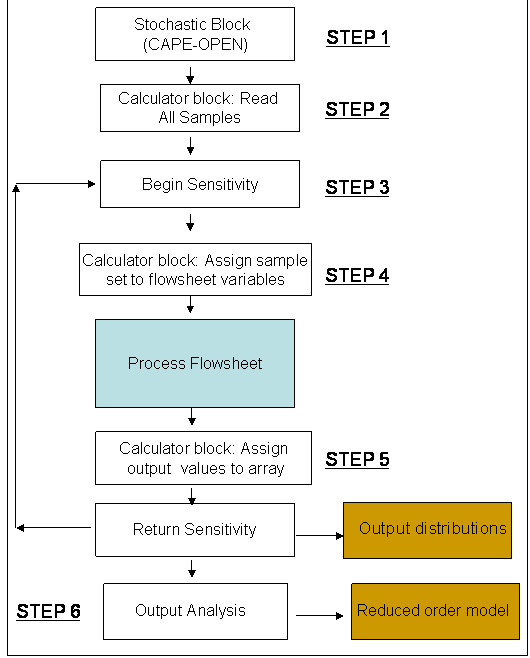 We have developed another CAPE-OPEN compliant tool using Visual Basic 6.0 and FORTRAN, to make stochastic simulation and reduced order model calculation more accessible to users The software simplifies the process of setting up a process modeled in the APECS (Advanced Process Engineering Co-Simulator) for stochastic simulation. The following figure shows the sequence followed by the stochastic simulation automation tool.