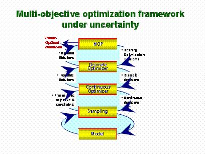 The problem of integrated solvent selection and solvent recycling gives rise to an optimization problem. This optimization is multi-objective problem and can be non-linear in nature involving both discrete and continuous variables. In addition to these inherent mathematical complexities, there are various kinds of uncertainties involved in CCS which can be elegantly handled in such an integrated framework. Some of these uncertainities are the estimation errors, process variations and physical properties of the solvent. Any robust solution to the design of absorption process needs to take into account such uncertainties to address real-life problems. To solve these problems, a five level multi-objective architecture as shown in the figure is to be used.