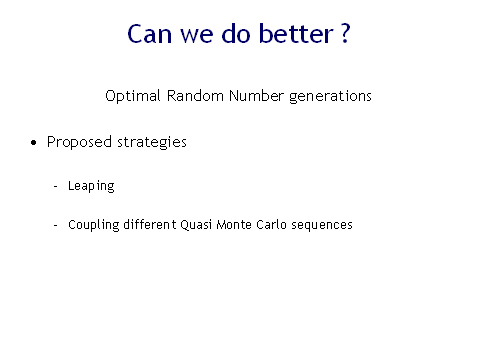 Randomness and random numbers are needed in a wide range of areas; they are of basic importance in computational statistics, in the implementation of probabilistic algorithms, and in related problems of statistical computing that have a stochastic ingredient like financial Modeling and artificial intelligence methods. In most applications, the actual relationship between successive points in a random sample has no physical significance; hence, randomness of the sample for approximating a uniform distribution is not critical. Quasi random (low discrepancy) sequences are designed to have better uniformity and perform better than pseudo random sequences. For higher dimensional stochastic processes, however, the quality of the quasi random sequences rapidly decreases. The focus of this research is to design optimal strategies for random number generations that will perform well in higher dimensions as well.